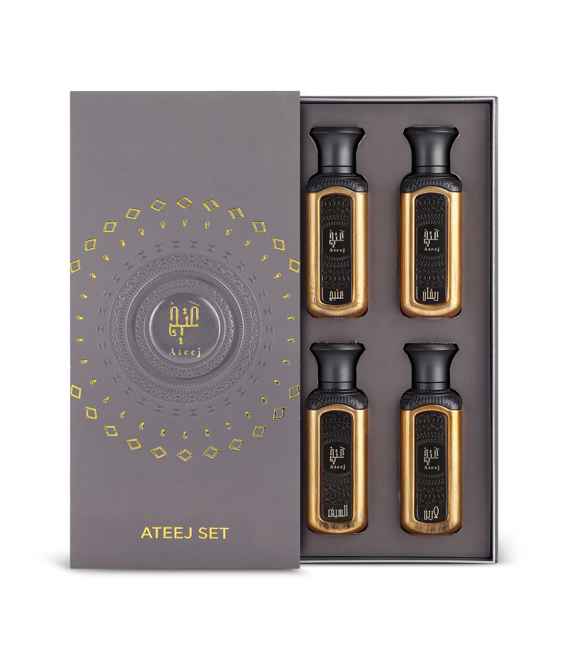 مجموعة عتيج ميني تجمع أربعة عطور فاخرة بحجم 50 مل لكل زجاجة. تصميم أنيق وروائح متنوعة تلائم جميع الأذواق والمناسبات، مما يجعلها خياراً مثالياً للاقتناء أو للإهداء.
